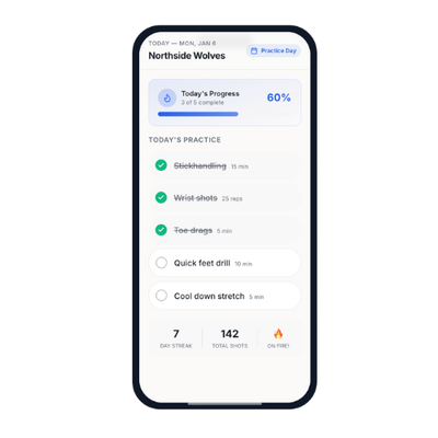 Built by hockey parents for hockey parents. Simple exercises. Quick checkoffs. Real accountability. For families who need help training on their own.
